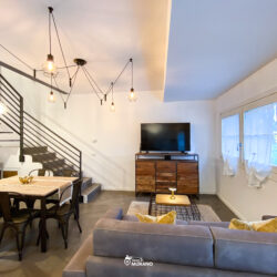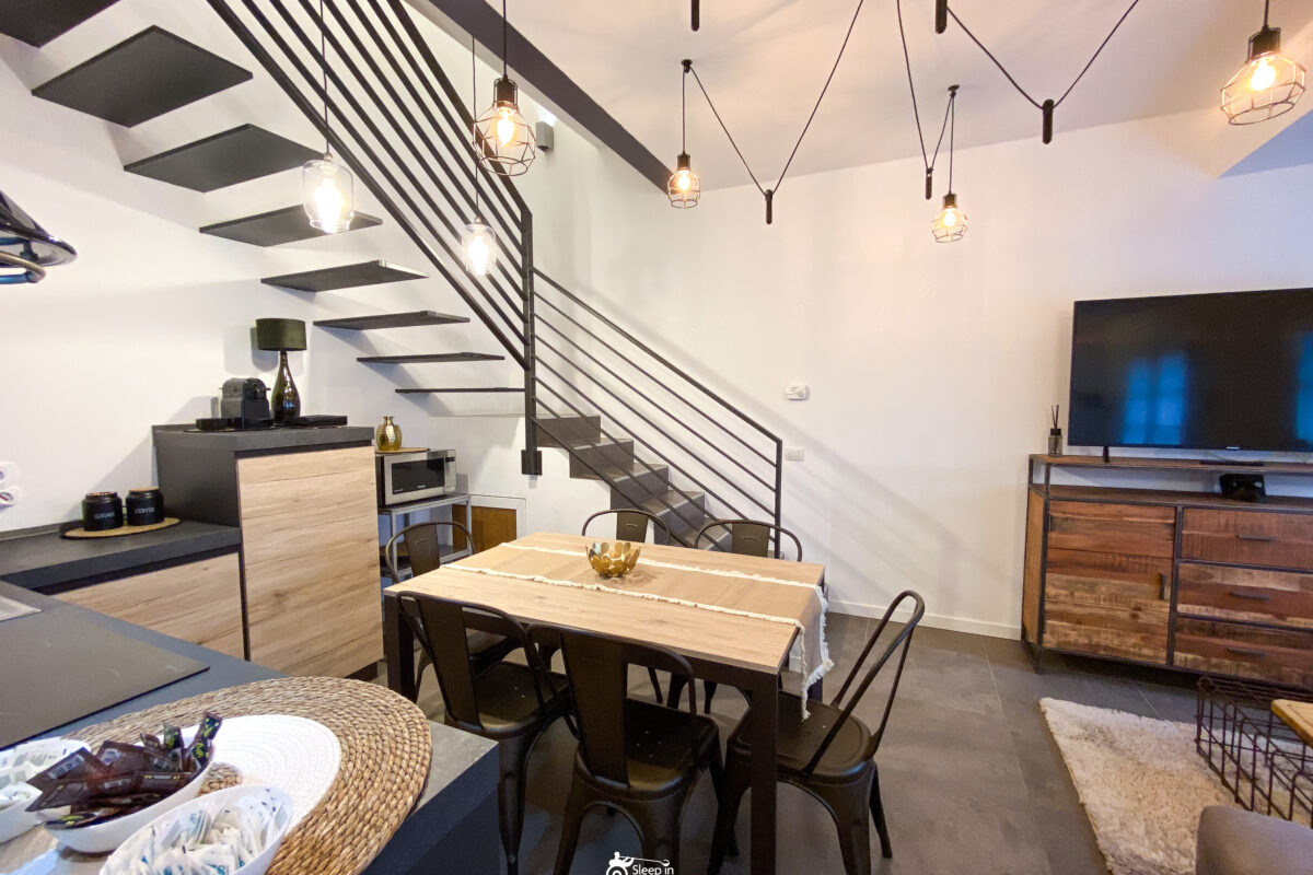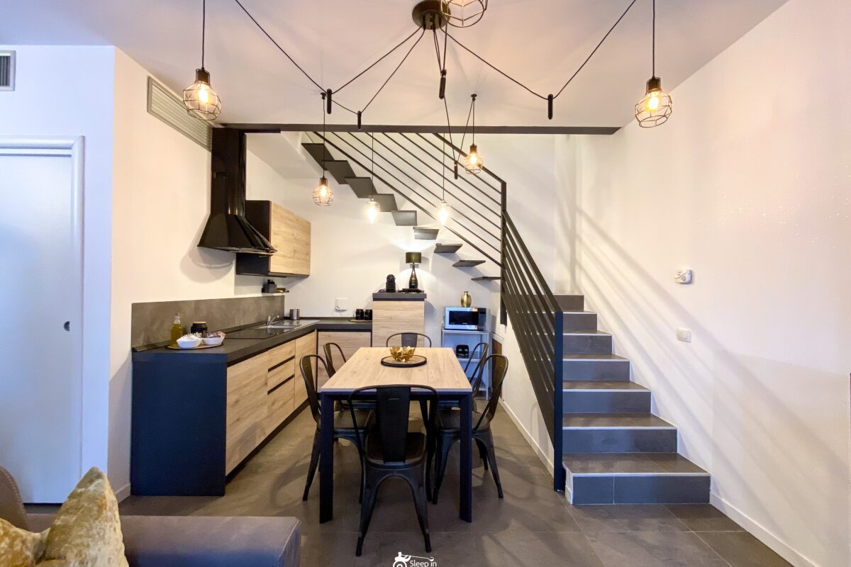 On the ground floor: a living room with a fully equipped kitchen, a lounge area with a sofa bed, and a bathroom with shower and bidet;